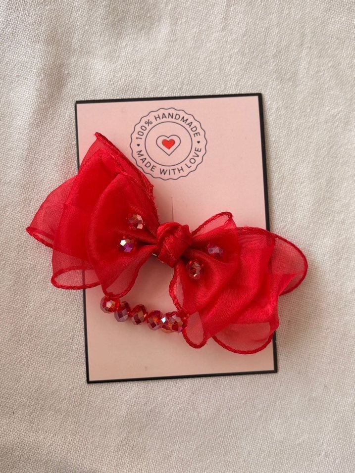 Renkli nakış ve boncuk detaylı kırmızı fiyonk saç tokası, sevgiyle el yapımı.