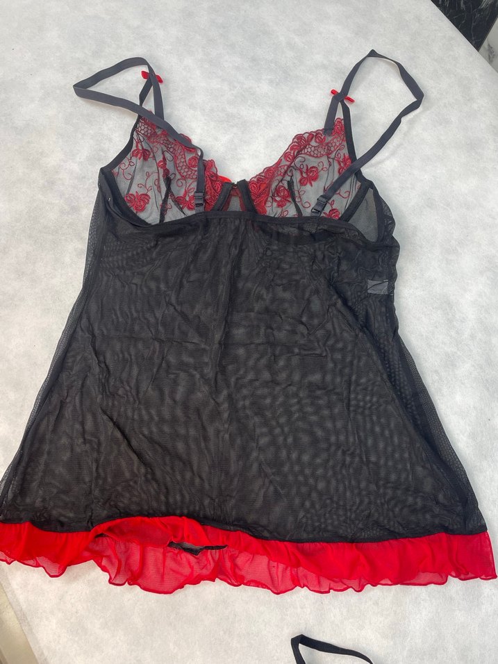Bu dar kesim gotik gecelik, koyu kırmızı nakış detayları, ip askılar ve kırmızı fırfırlı etek ucu ile midi boyda. Şeffaf siyah kumaş ve detaylı nakışlarla dikkat çekiyor. S M beden uyumludur.Hijyen açısından iade yoktur.Sıfır paketli üründür.