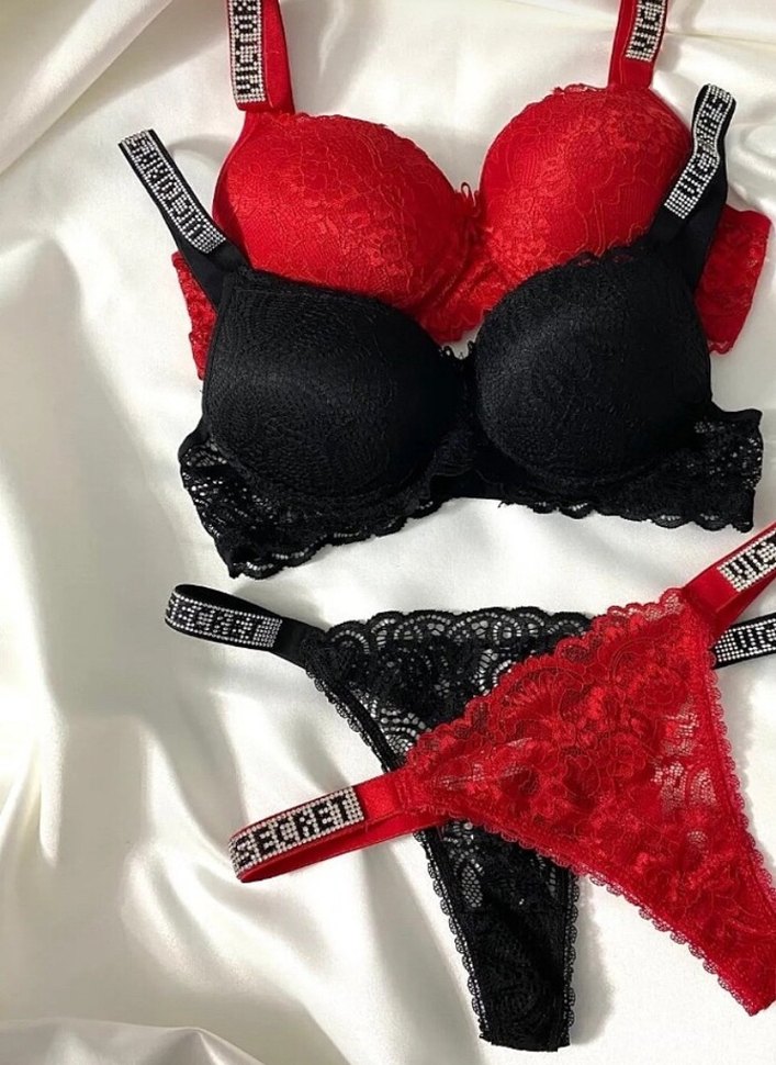 Koyu kırmızı nakışlı, gotik tarzda kısa uzunlukta sütyen. 'SECRET' yazılı askılarıyla dikkat çeker.