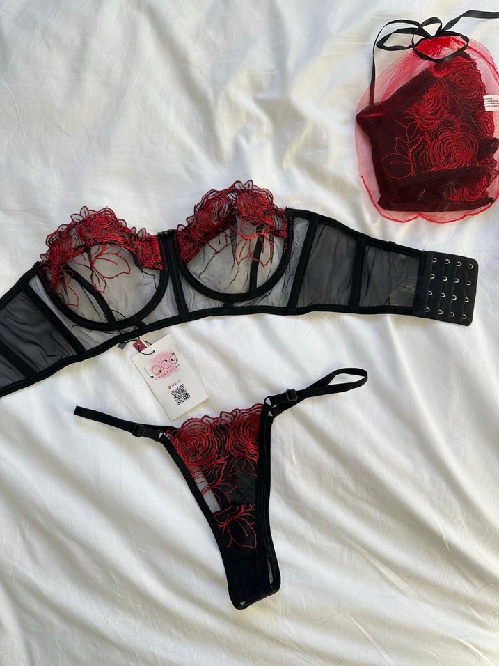 Gotik tarzda, siyah tül üzerine koyu kırmızı nakışlı çiçek desenli kısa kesim sütyen. Ayarlanabilir askılar ve kancalı kapanış içerir.