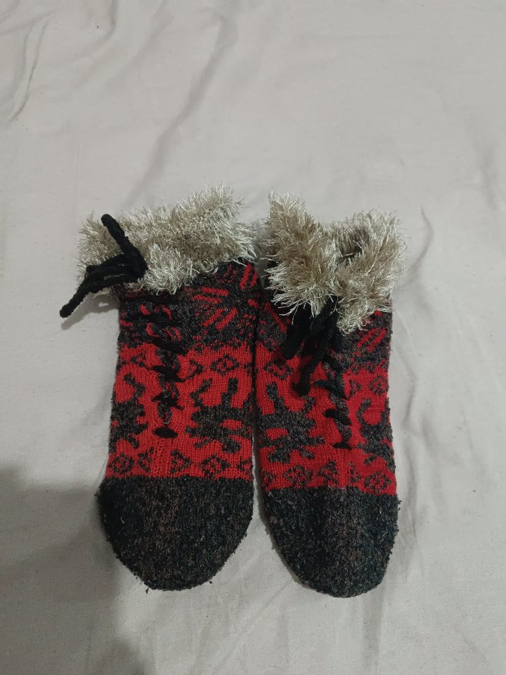 Nakışlı desenli kırmızı örgü Kadın ev terliği, tüylü manşetiyle sıcaklık ve rahatlık sağlar.