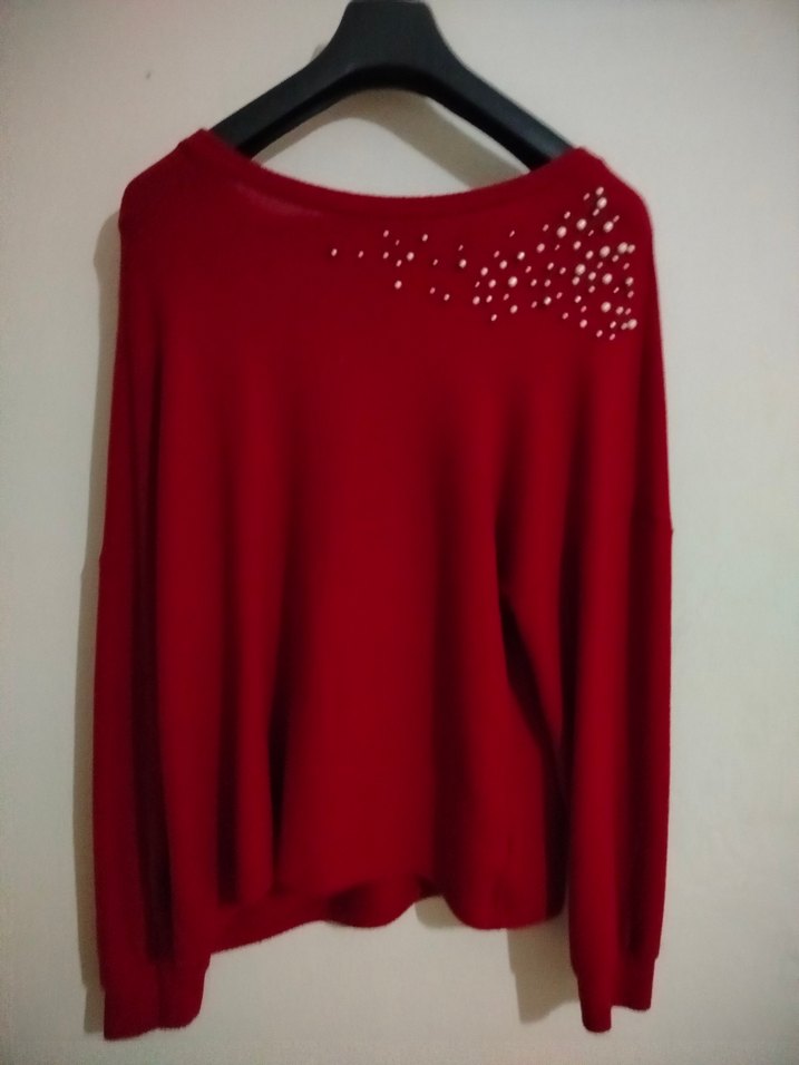 Kırmızı renkli, uzun kollu ve yuvarlak yakalı triko kazak, yakasında parlak nakış detayları bulunur. Salaş kesimi ve normal boyu ile günlük kullanıma uygundur.