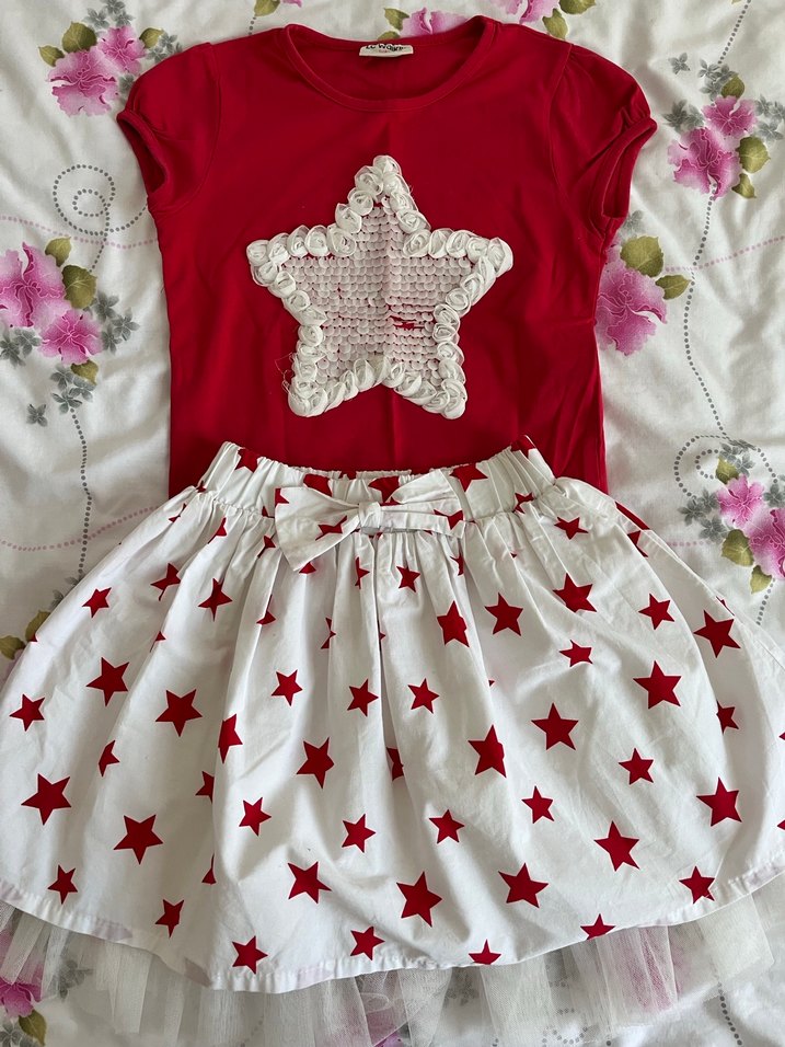 Pamuk kumaştan yapılmış, beyaz zemin üzerine kırmızı nakışlı yıldız desenli, fırfırlı ve vücuda oturan bohem tarzda kız çocuk eteği.