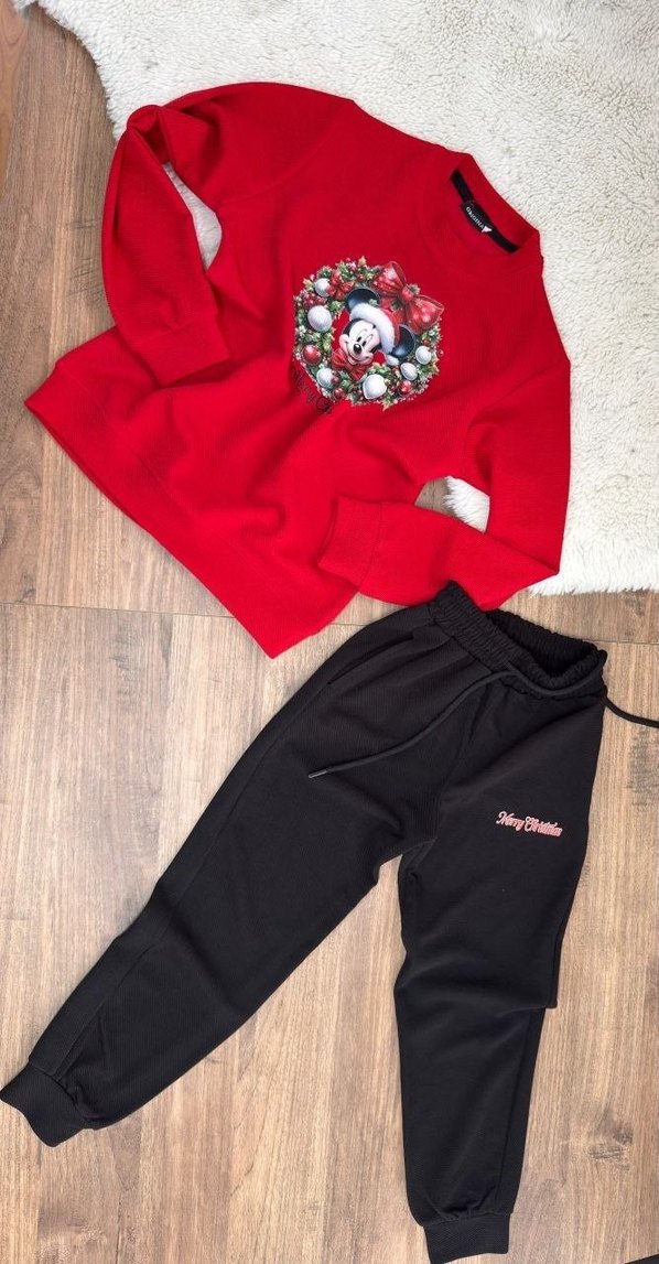 Kırmızı, nakış işlemeli, uzun kollu ve bisiklet yaka bol kesim sweatshirt ile siyah, örgü bel bantlı eşofman altı. Streetwear tarzı için uygun