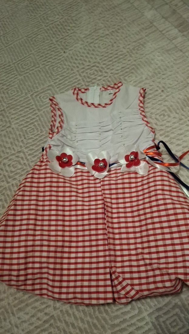 Kolsuz, dar kesim kız elbisesi, kırmızı kareli desenli ve nakışlı volan detaylı. Sentetik kumaştan, askısız yaka ve renkli tasarım