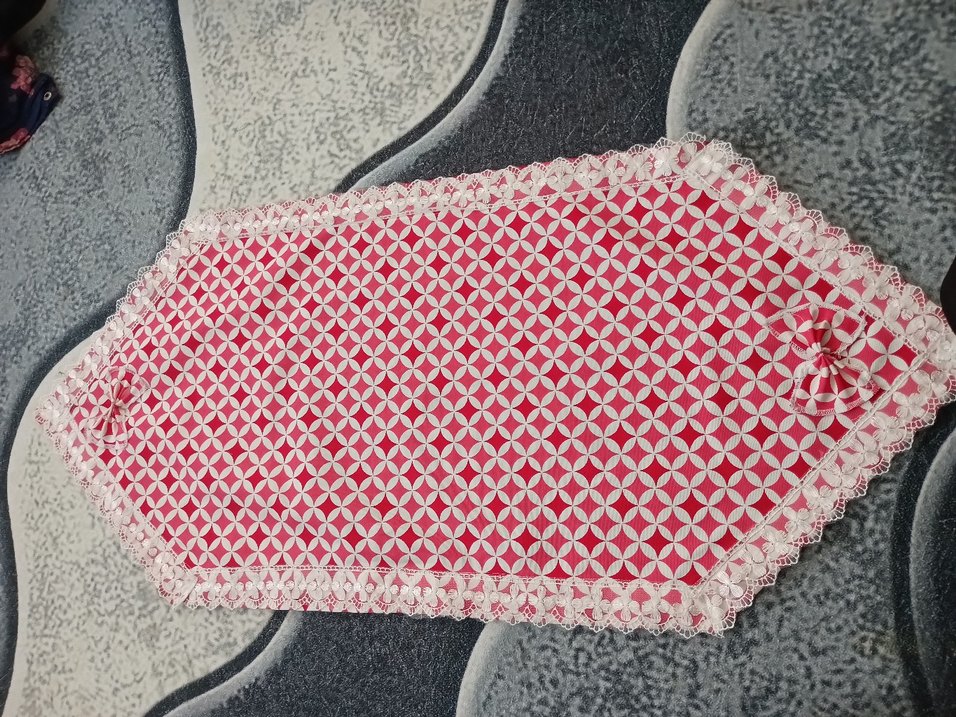 Nakışlı geometrik desen ve zarif dantel kenarlarla kırmızı masa örtüsü. Renkli ve klasik bir dokunuş sağlar. ️