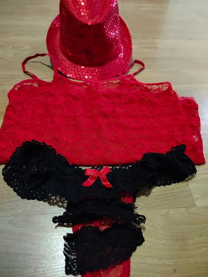 Nakışlı detaylara sahip kısa askılı kırmızı üst ve kırmızı fiyonk detaylı siyah dantel alt ile gotik tarzda dar şapka ile birlikte egzotik tarz..