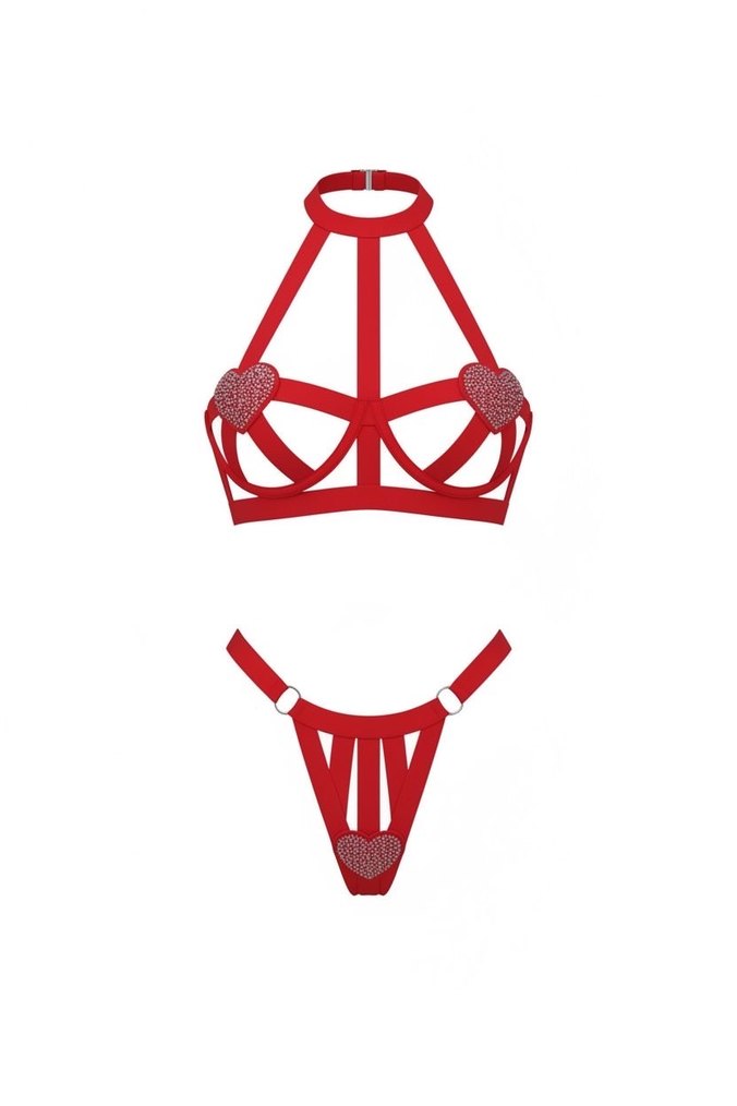 Kırmızı nakışlı kalp detaylı, askılı mini sütyen ve tanga takımıdır. ❤️