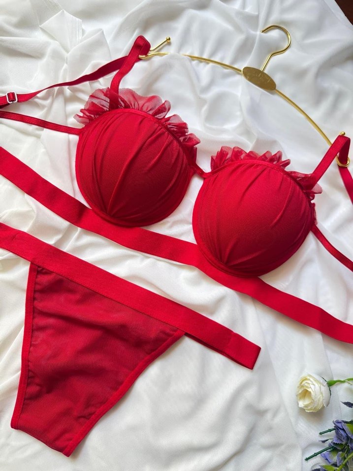 Kırmızı nakış detaylı, kısa ve mini tarzda, narin fırfır süslemeli sütyen takımı. Çağdaş ve Paris tarzı birleşimi. ❤️