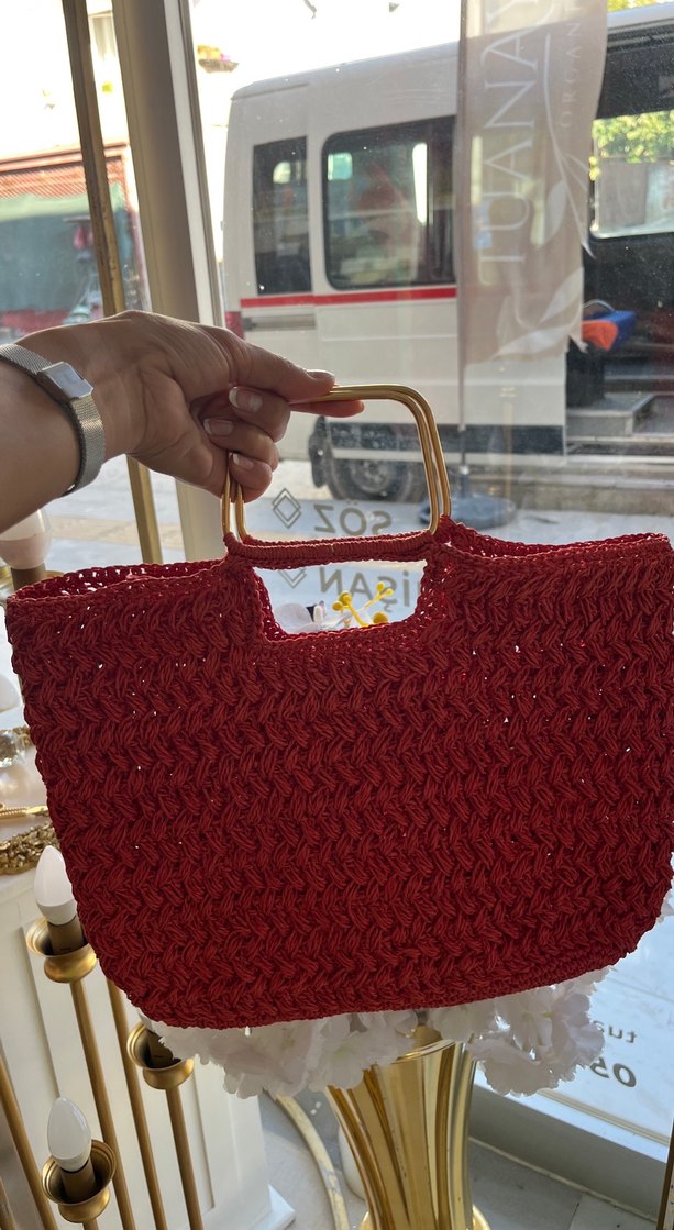 Parlak kırmızı örgü kadın çanta, nakışlı detaylar ve metal saplı, bohem tarz için uygun.