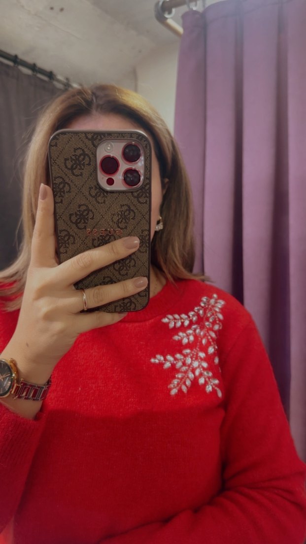 Kırmızı renkli, yuvarlak yaka ve uzun kollu örgü kazak. Nakış detaylarıyla bohem tarzını yansıtan, rahat ve normal uzunlukta bir model.