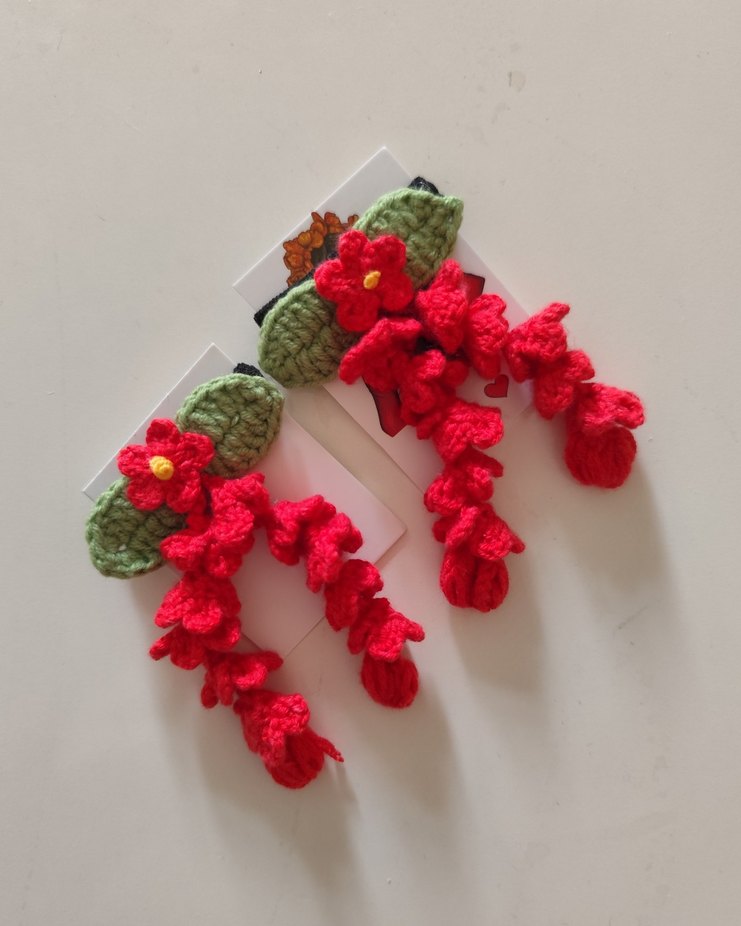 Nakışlı çiçek detaylı, yeşil yapraklı kırmızı örgü çocuk saç tokaları, renkli bohem tarzıyla öne çıkar.