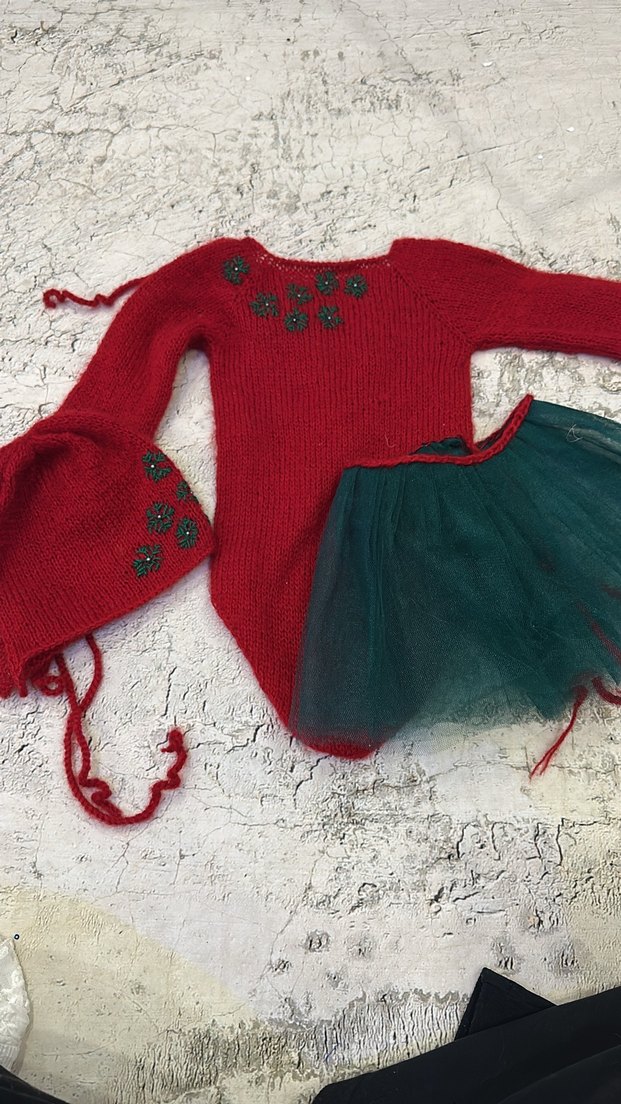 1-2 yaşa uyumlu Nakış detaylı kırmızı örgü uzun kollu üst, koyu tül etek ve uyumlu örgü şapka içeren kız bebek takımı. Fotoğrafçı kostümü 1 yaş kostüm