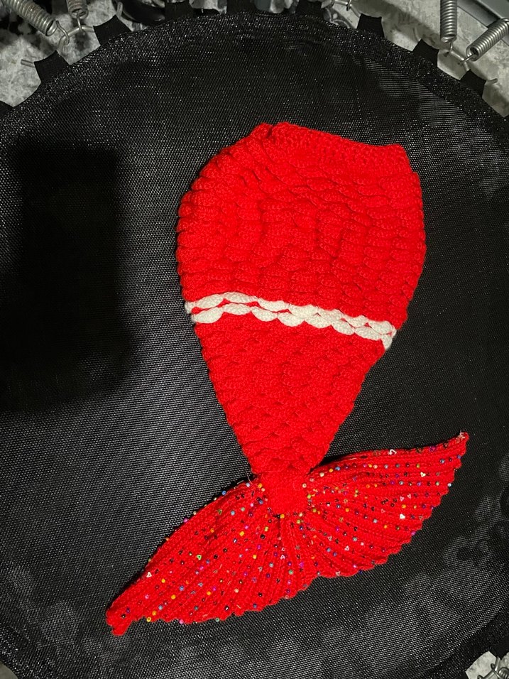 Kırmızı örgü ve renkli nakış detaylı, avangart tarzda kız çocuk broş. Aylık çekim için uygun, pop kültür esintili tasarım. Kızımda kullandım 6 9 aylık için uygundur bel kısmını çengelli iğneyle tutturdum el örgüsüdür