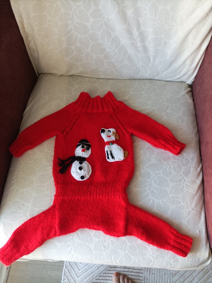 Renkli nakışlı kardan adam ve köpek desenleriyle kırmızı örgü köpek kıyafeti, normcore tarzında. kızımın köpeği için ördüm ama çok küçük geldi o yüzden satışta.ölçüleri fotolarda.