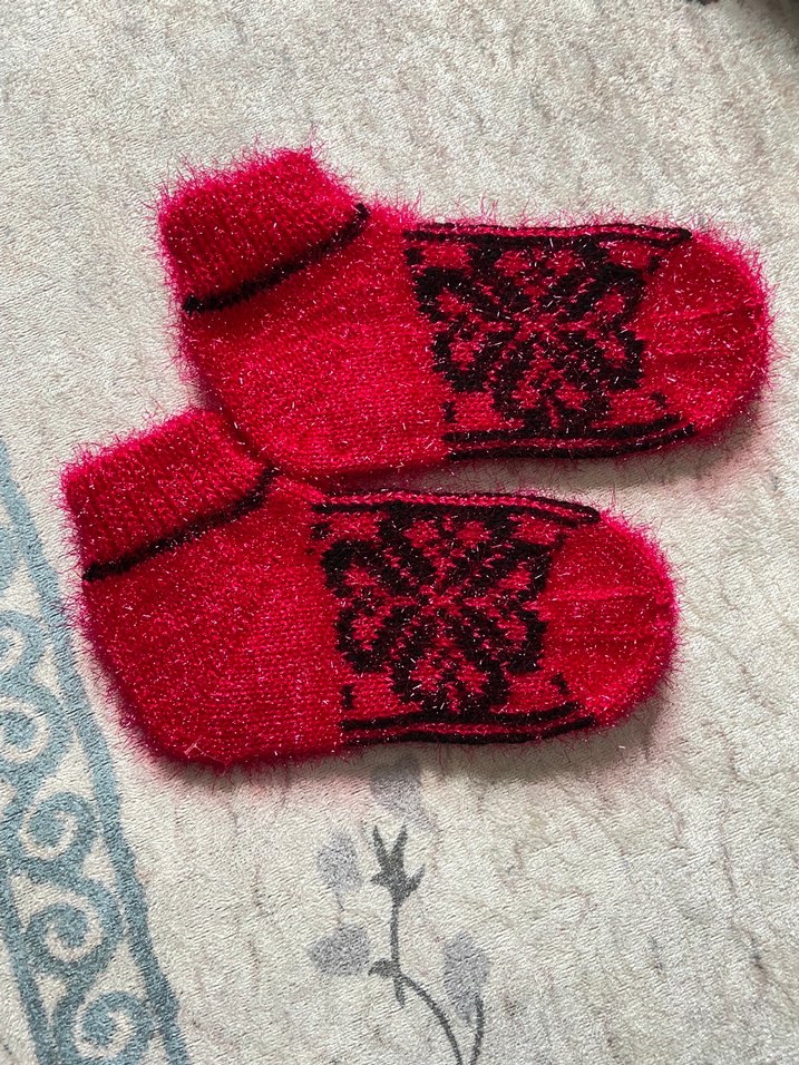 yumuşak triko malzemeden yapılmış, canlı kırmızı renkte ve renkli nakışlı desenlere sahip çoraplar. Sıcak tutar ve şık görünür.