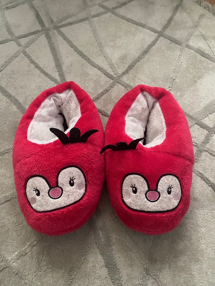 kırmızı, nakışlı ve şişkin yapıda, yumuşak kumaştan sıcak terlikler. Renkli ve pop kültür esintili detaylar içerir. İyi durumdadır yırtığı yoktur 36 37 numaraya uygun