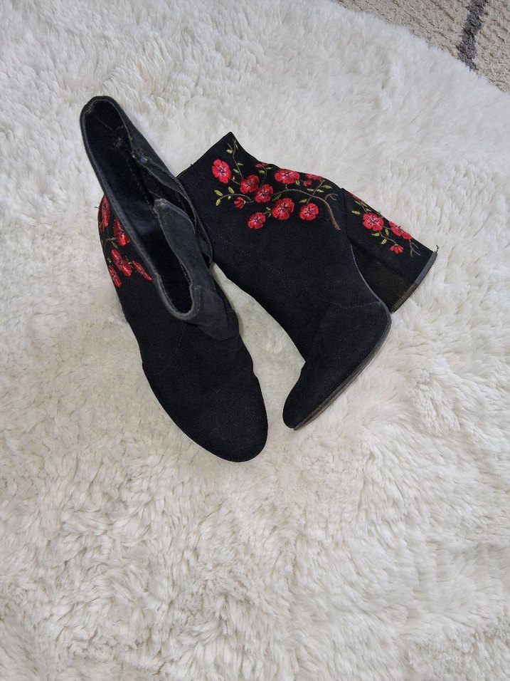 Kırmızı çiçek nakışlı, süet malzemeden yapılmış blok topuklu kadın botlarıdır. Kürk detaylarıyla bohem ve gotik tarzı yansıtır, romantik akşamlar için uygundur.