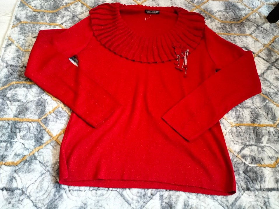 Kırmızı, nakışlı detaylı triko kadın kazak, parlak dokusuyla dikkat çeker. Yuvarlak yaka, uzun kollu ve rahat kesimlidir, günlük kullanıma uygundur. yakada örme gül modeli mevcut.