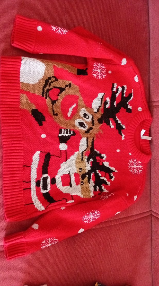 Kırmızı renkli, nakışlı desenlere sahip, triko kumaştan yapılmış, bisiklet yakalı ve uzun kollu, rahat kesim kadın kazak. pusurlendi biraz