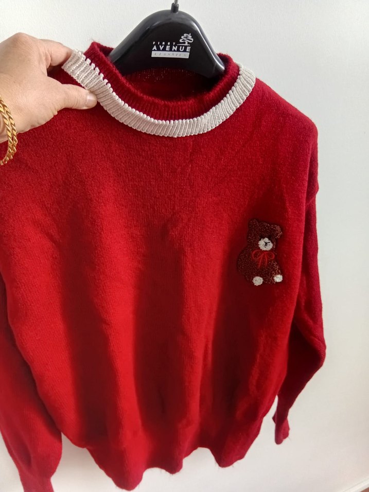 Kırmızı triko kazak, beyaz ribanalı yuvarlak yaka ve nakışlı ayıcık detayıyla dikkat çeker. Uzun kollu ve bol kesimdir, rahat bir stil sunar.