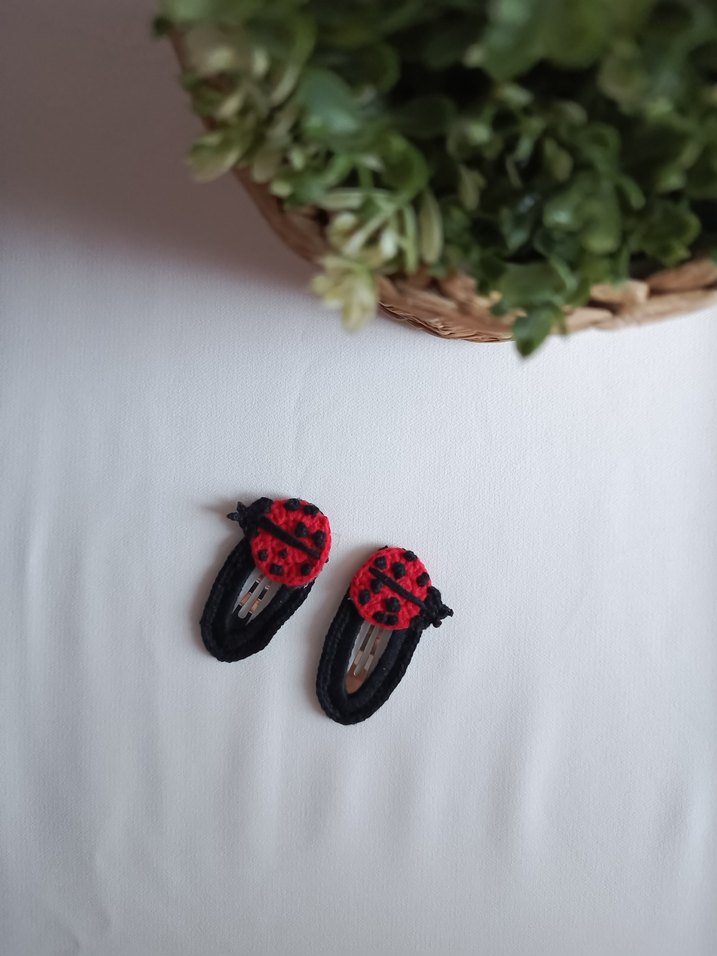 Kırmızı uğur böceği örgü çocuk saç tokası Renkli ve sade tasarımıyla saçlara şirin bir dokunuş katar.