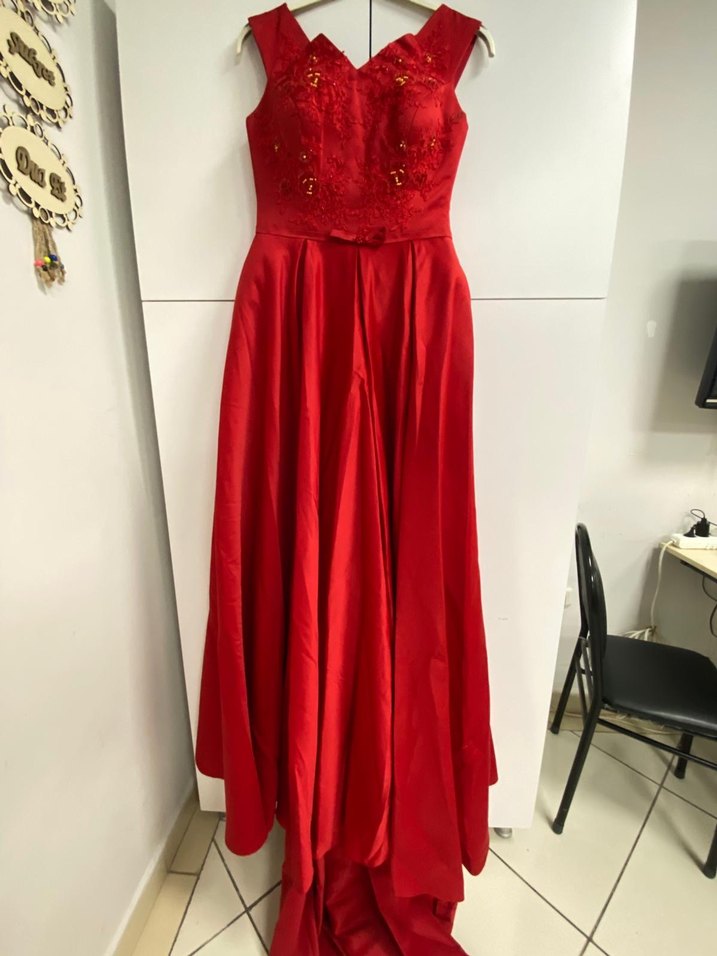 Kırmızı, V yaka, nakışlı ve drapeli uzun abiye elbise, klasik ve vintage tarzı bir araya getirir. Düğünlere uygun, kolsuz ve vücuda oturan kesim.