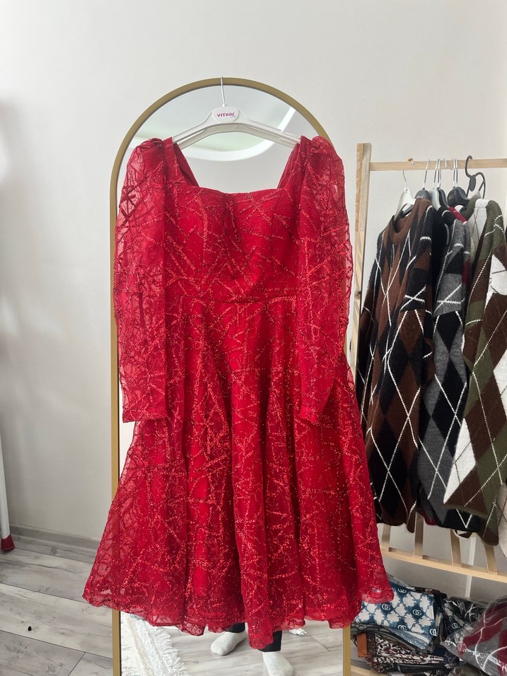 Kırmızı, V yaka ve ince askılı uzun abiye elbise. Nakışlı parlak deseni ve dökümlü regular kesimi ile düğünler için uygun vintage tarzda.