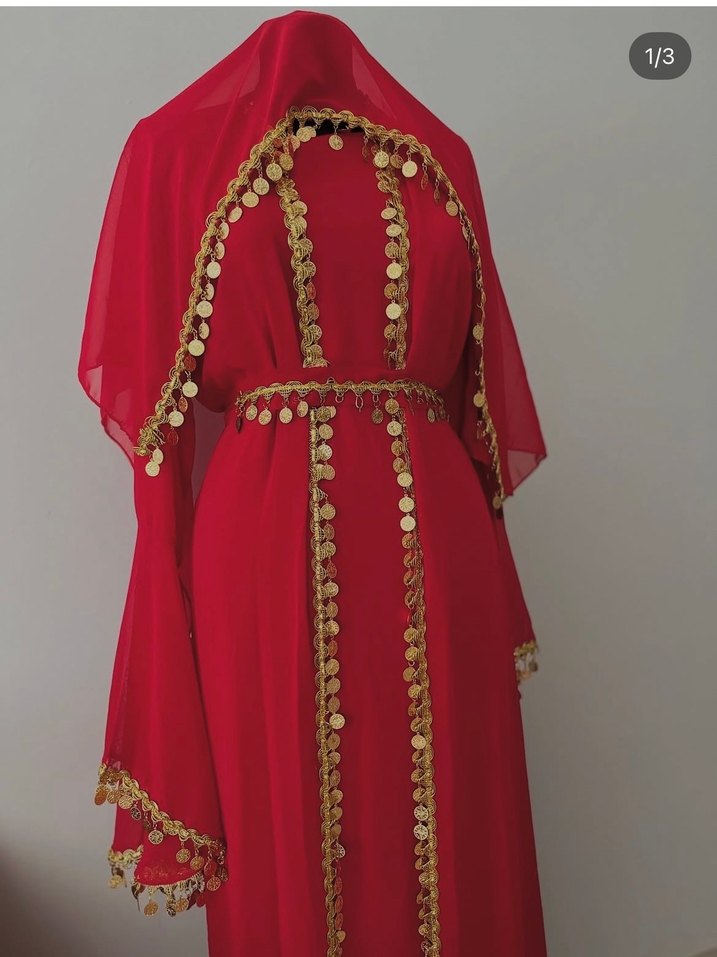 Bu uzun kırmızı hint elbisesi, bol kesim ve drapeli detaylara sahiptir. Nakışlı desenleri, V yakası ve askılı kolları ile parlak altın süslemelidir, düğünler için uygundur.
