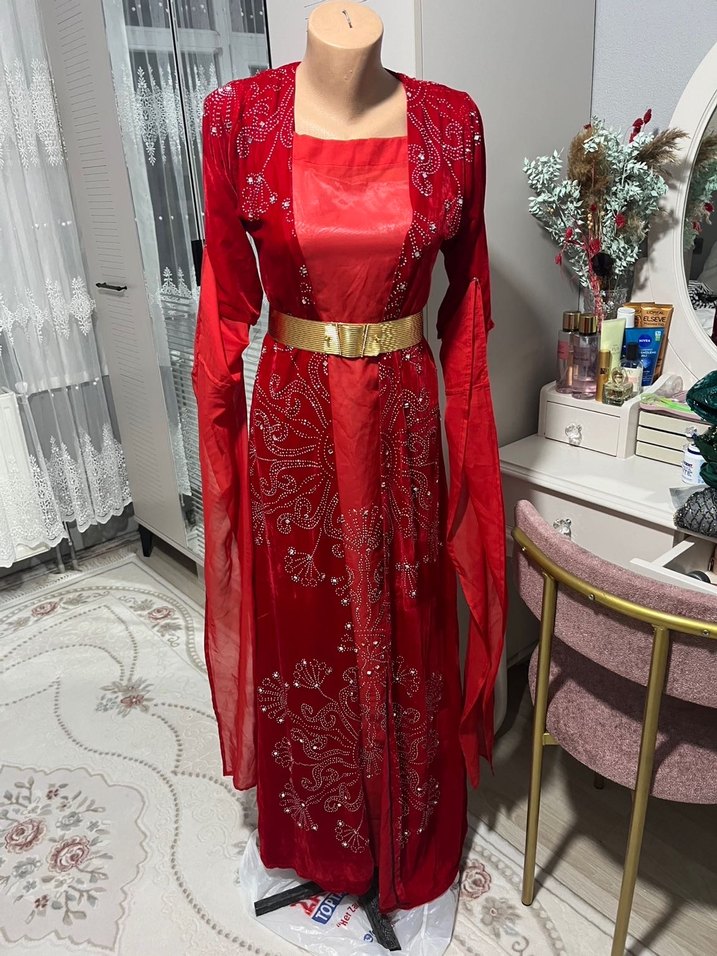 Uzun kırmızı kına elbisesi, nakışlı desenler ve drapeli tasarıma sahiptir. Uzun kollu, straplez yakalı ve regular fit kesimlidir, düğünler için uygundur. ✨ Ürün bir iki kez giyildi herhangi bir deformesi yoktur.157-160 boyunda 36-38 beden için uygundur.(Kemer görsel amaçlıdır.)
