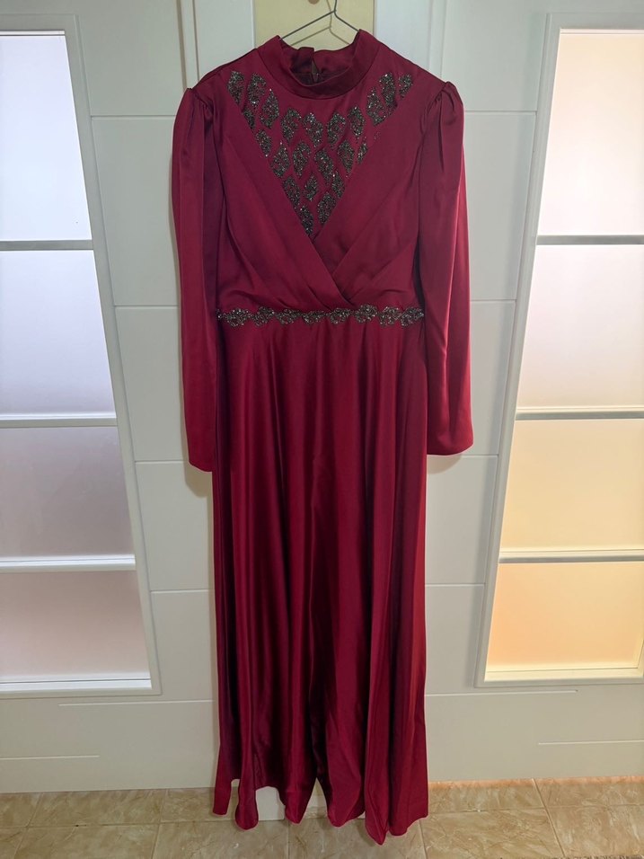 Kırmızı renkli, yüksek yakalı ve uzun kollu uzun abiye elbise. Bol kesim, drapeli ve nakışlı detaylara sahip, klasik vintage tarzda. Düğün ve özel etkinlikler için uygundur.