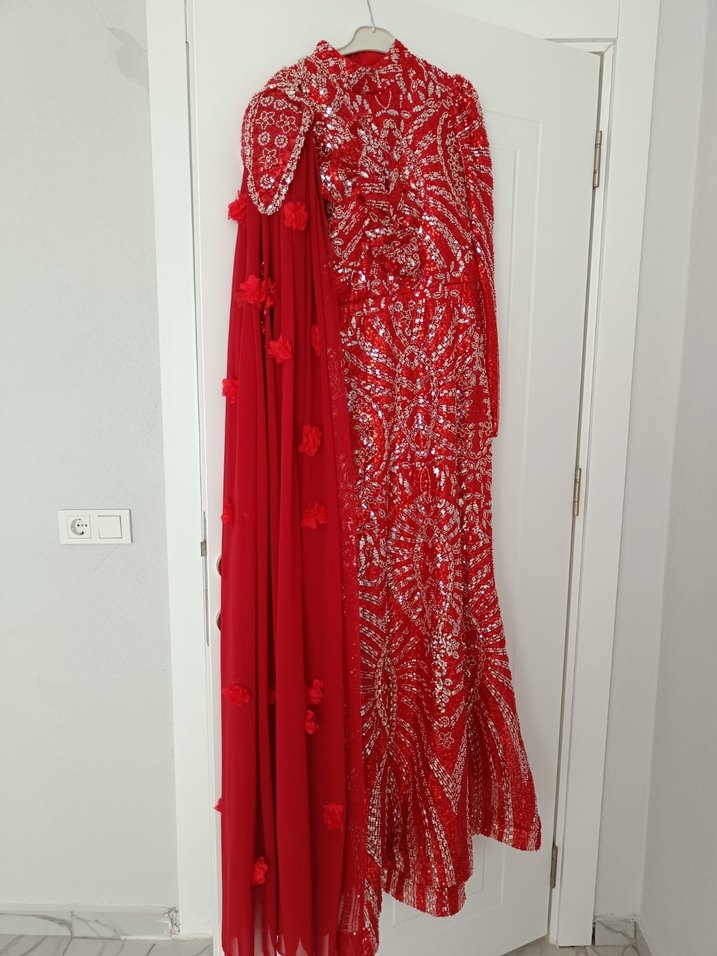Özel dikim kırmızı abiye. 38-40 beden uyumlu. Şalı ile birlikte gönderim yapılır. Pazarlık payı vardır