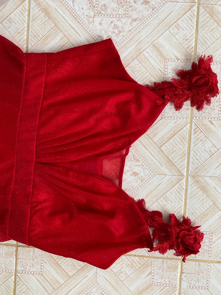 Kırmızı, nakışlı ve fırfırlı askılı V yaka, uzun ve vücuda oturan abiye elbise. Düğünler için bohem ve göz alıcı bir tasarım.