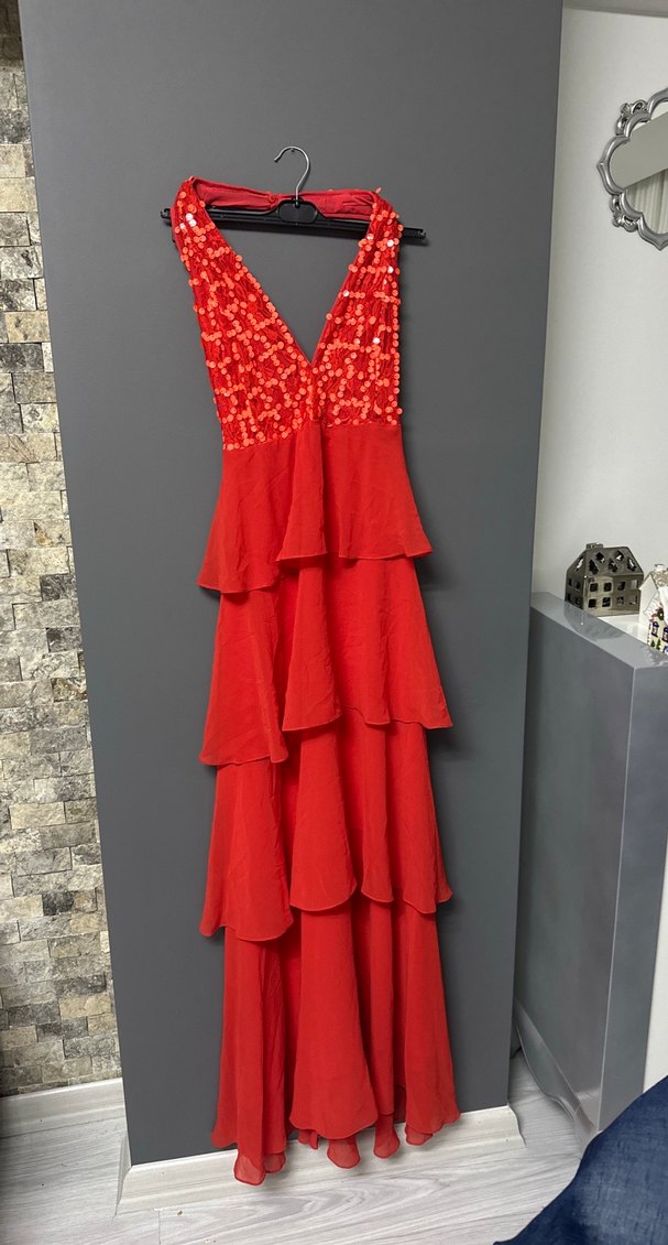 Nakışlı ve renkli detaylara sahip V yakalı, kolsuz, uzun boy kırmızı abiye elbise. Fırfırlı katmanlarıyla düğünler için uygun, vücuda oturan kesim.