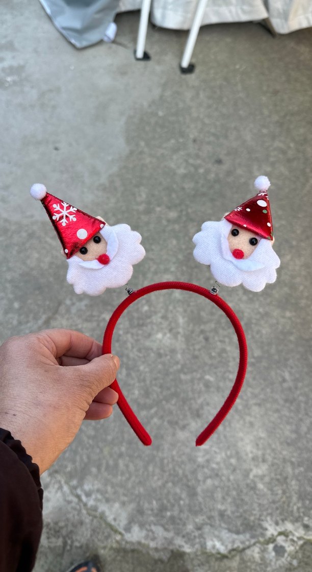 Kırmızı saç bandı üzerinde renkli nakışlı Noel Baba figürleri ve fiyonklar bulunur, şenlikli bir görünüm sağlar.