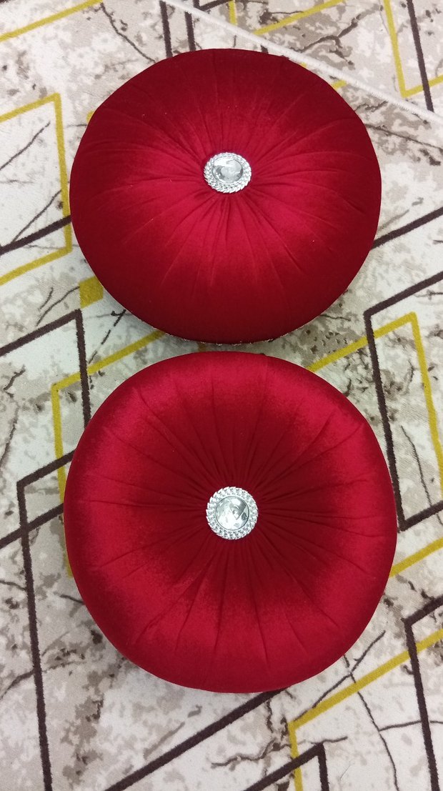 Kırmızı nakışlı detaylara ve ortasında dekoratif düğmeye sahip yuvarlak yastıklar. Geleneksel tarzda ve canlı renklidir. ️ürün yenidir hiç kullanılmadı