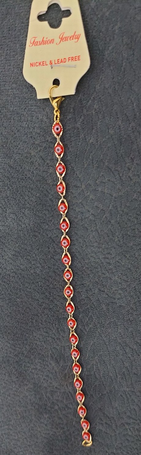 Kadın bilekliği, zincir üzerine işlenmiş kırmızı detaylara sahip. Bohem tarzıyla günlük kullanıma uygun, retro ve hippie havası taşıyor.