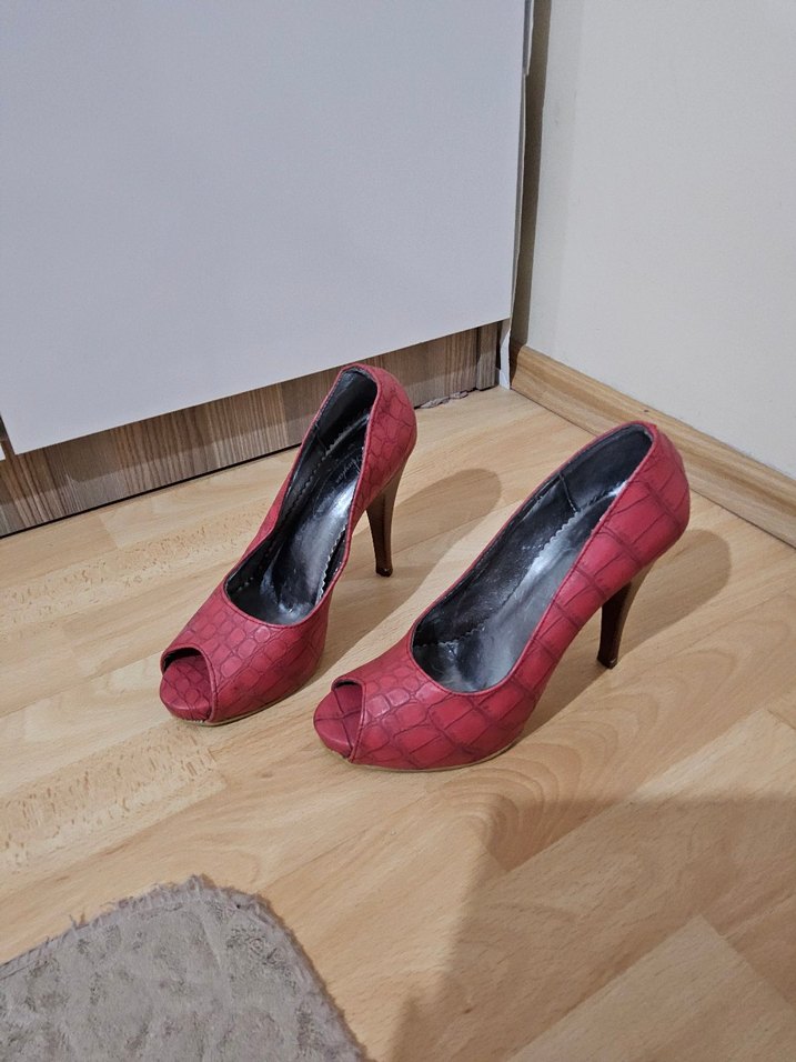 Kırmızı/Nar Çiçeği Yılan Derisi Desenli Ucu Açık Topuklu