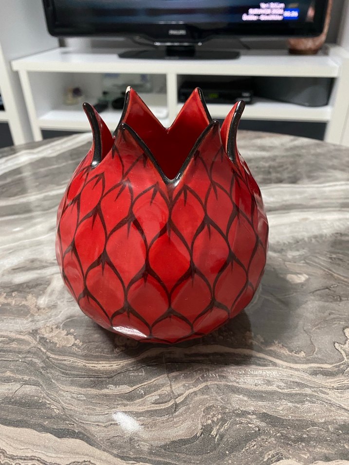 Parlak yüzeyli, siyah desenli koyu kırmızı nar şeklinde figürin.