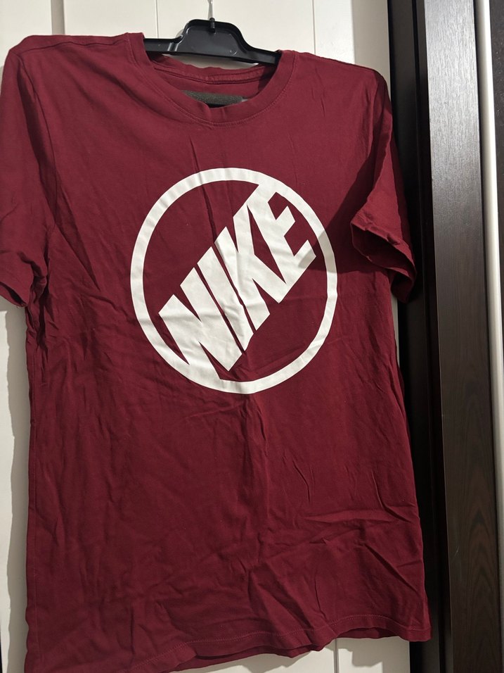 Kırmızı renk, yuvarlak yaka ve kısa kollu Nike erkek tişörtü. Rahat kesimi ve baskılı logo ile günlük sokak stiline uygun, ipeksi dokuda.