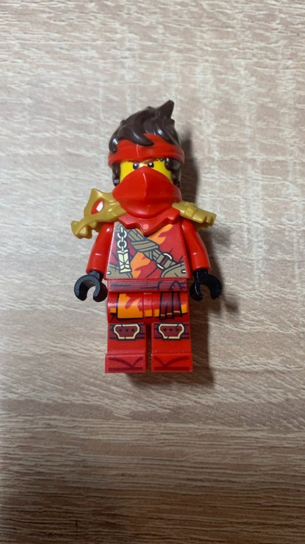 Kırmızı ninja temalı Lego figürü, ayrıntılı zırh ve kırmızı yüz maskesi ile tasarlanmıştır. Siyah elleri ve kahverengi saç parçası vardır.