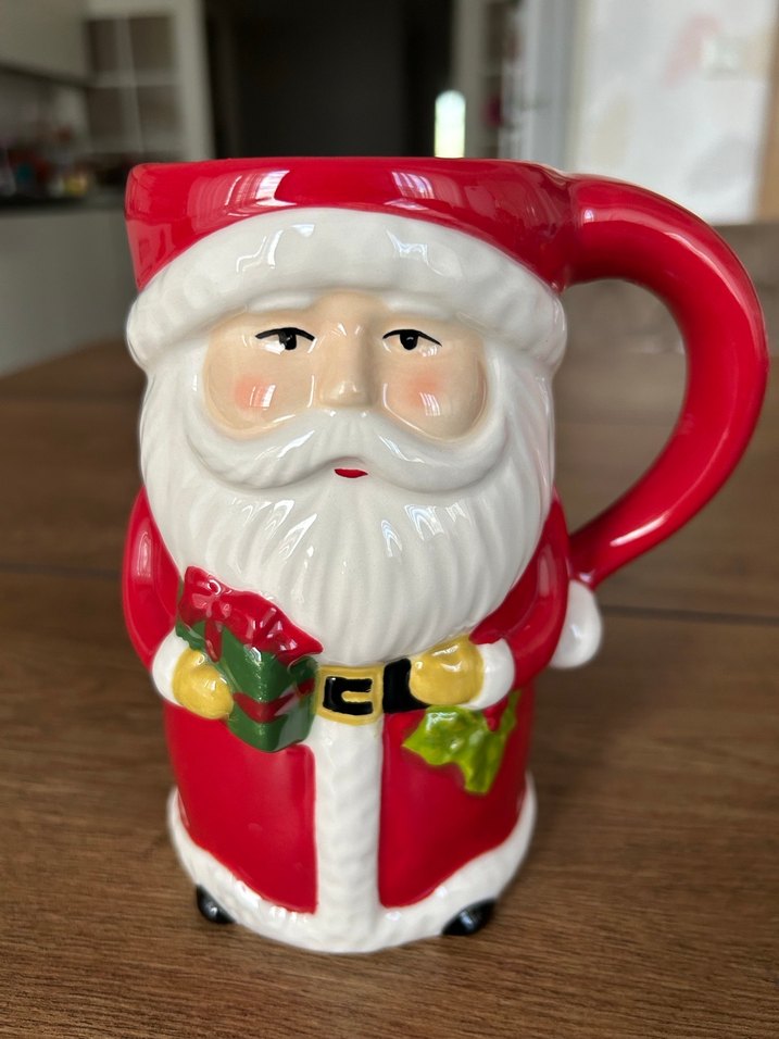 Kırmızı saplı, detaylı Noel Baba figürlü renkli seramik kupa. Tatil içecekleri için uygun .