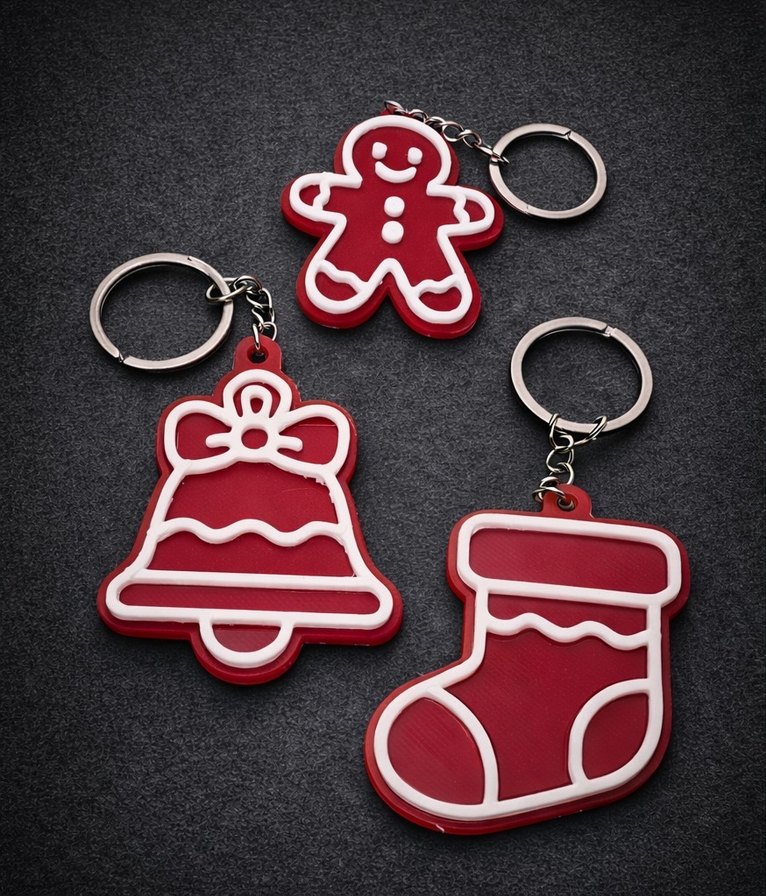 Kırmızı renkte, beyaz detaylı zencefilli adam, çan ve çorap şeklinde üç anahtarlıktan oluşan set, zincir bağlantılıdır.