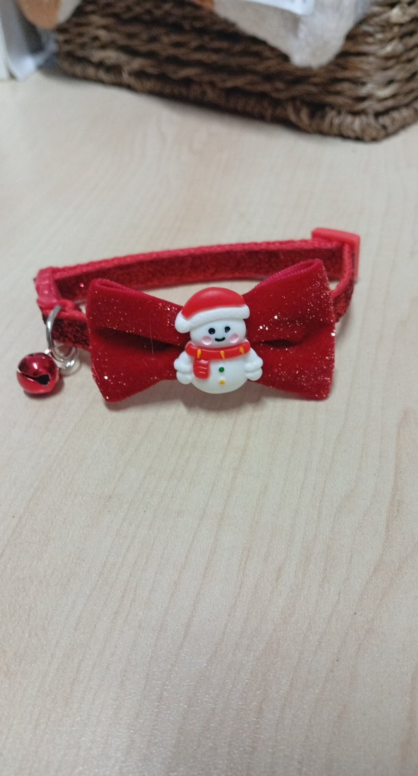Renkli kırmızı kedi tasması, noel temalı kardan adam fiyonk ve küçük bir zil içerir.