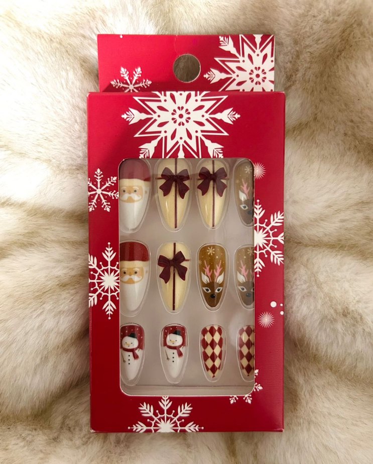 Kırmızı tonlarda, Noel temalı tırnak süslemeleri. Noel Baba, kurdele, geyik ve kardan adam desenleri içerir .