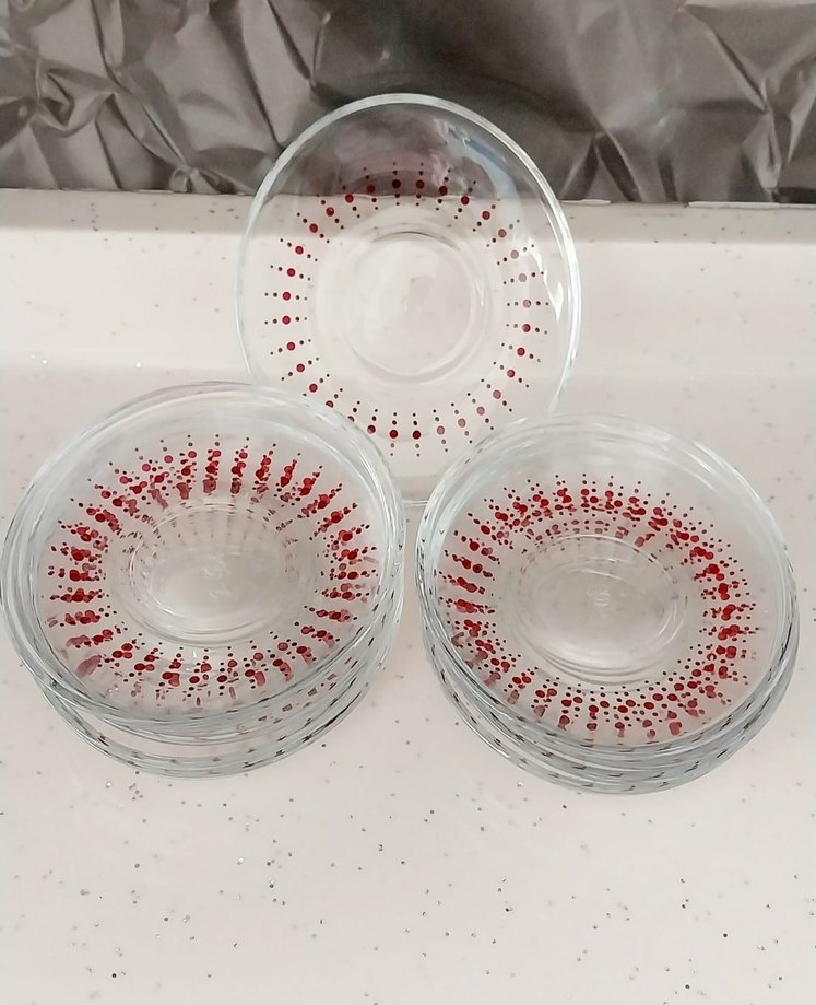 Kenarları kırmızı renkli nokta desenleriyle süslenmiş şeffaf cam çay tabakları seti.