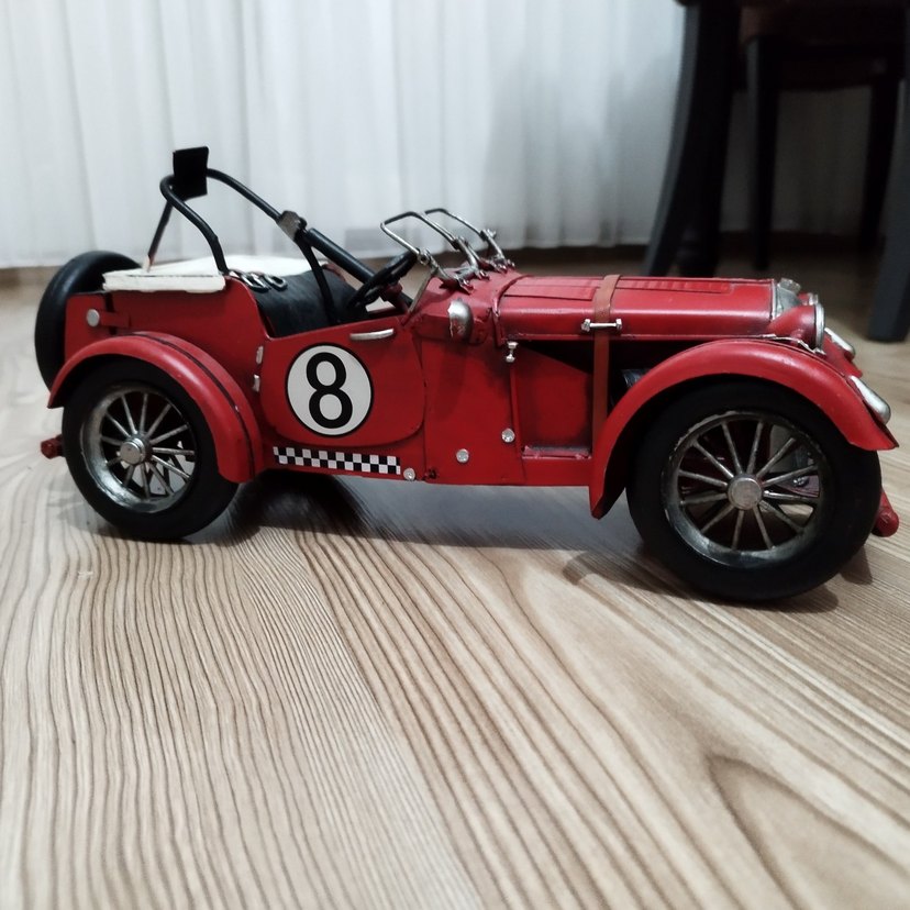 Detaylı tekerlekleri ve 8 numaralı işareti olan kırmızı renkli oyuncak araba. Uzunluk:34 cm Eni : 13 cm Yükseklik: 11 cm metal alaşımlı dekoratif, koleksiyonluk model
