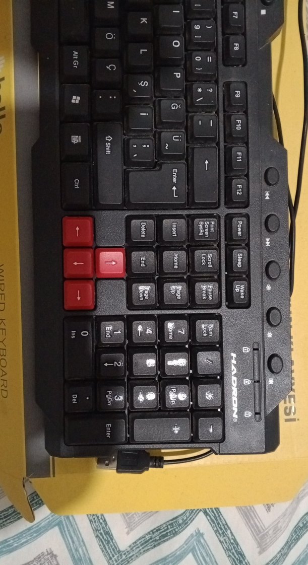 Kırmızı ok tuşlarına sahip koyu renk klavye, multimedya tuşları ve sayısal tuş takımı içerir. Kablolu bağlantılıdır.
