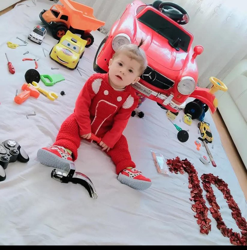 Kırmızı örgü kumaştan yapılmış, desensiz ve sokak tarzına uygun bebek tulumu.