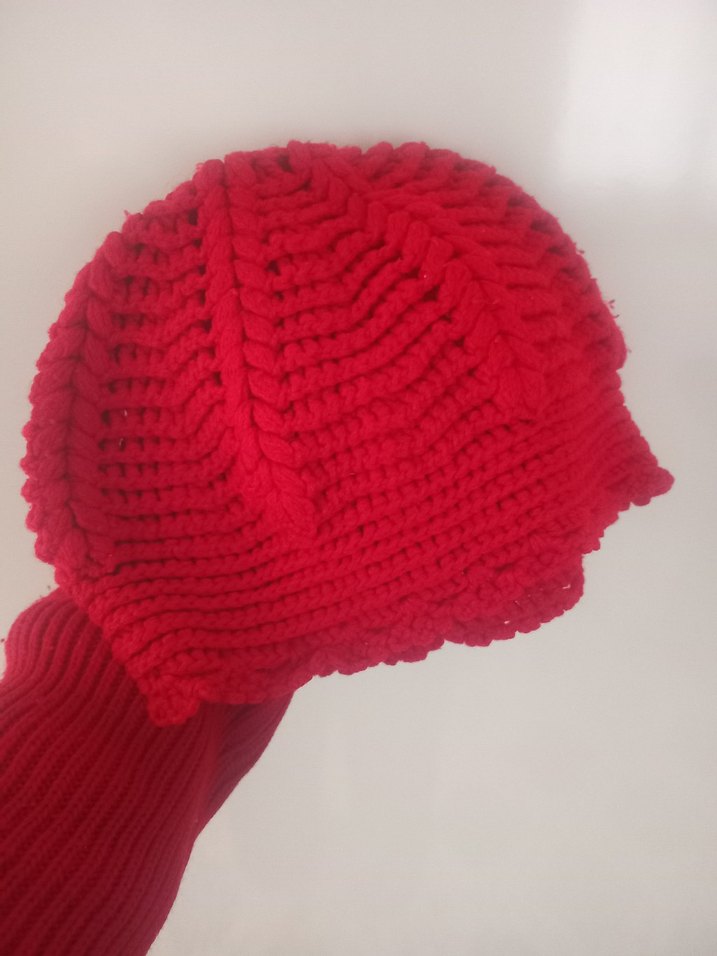 Canlı kırmızı renkte örülmüş, rahat ve şık bir örgü bere. Küçük bir bere çocuklar için uygun